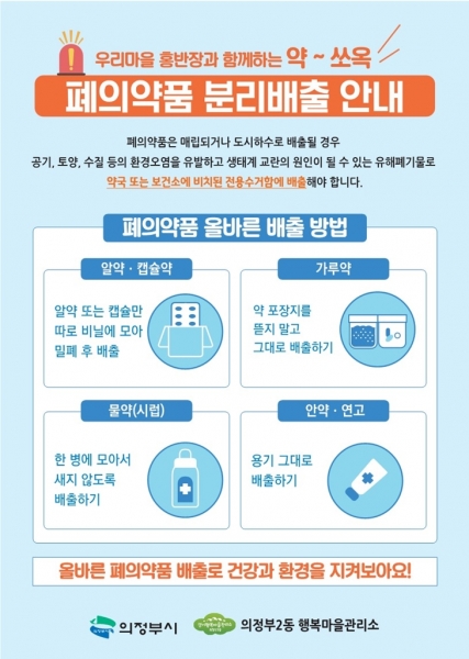가정 내 복용하고 남은 약과 유통기한이 지난 약 등 불용의약품이 있으면 의정부2동 행복마을관리소로 방문해 배출하면 된다.