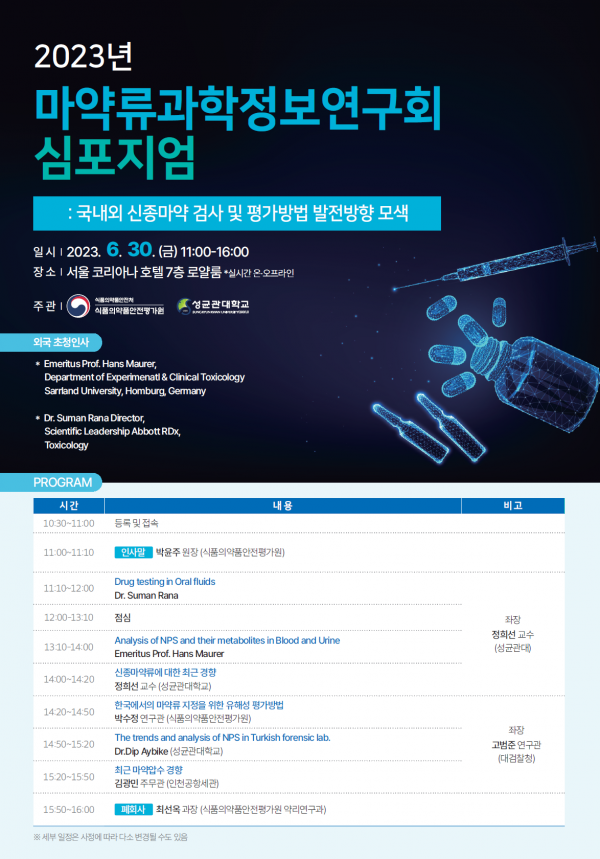 이번 심포지엄의 주요 내용은 타액을 이용한 마약 검사법 혈액과 소변에서 신종마약과 대사체 분석 국내외 신종마약류의 최신 동향 마약류 지정을 위한 유해성 평가 방법 등이며 사전에 등록하면 누구나 온라인으로 심포지엄에 참여할 수 있다.