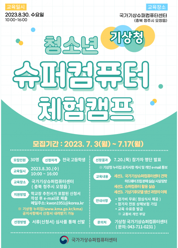 [금요저널] 기상청은 7월 3일부터 7월 17일까지 전국 고등학생을 대상으로 ‘청소년 슈퍼컴퓨터 체험캠프’참가자를 모집한다고 밝혔다.