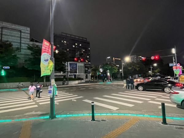 바닥형 보행신호등은 통행량이 많은 횡단보도 앞 보행자 신호 대기선에 LED등을 설치해 신호에 맞춰 색상이 바뀌며 최근 급증하는 스몸비 교통사고를 예방하기 위해 설치했다.