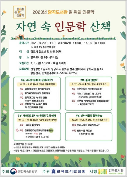 [금요저널] 김포시립 양곡도서관은 8월 20일부터 11월 5일까지 ’길 위의 인문학 _자연 속 인문학 산책’ 프로그램을 운영한다.