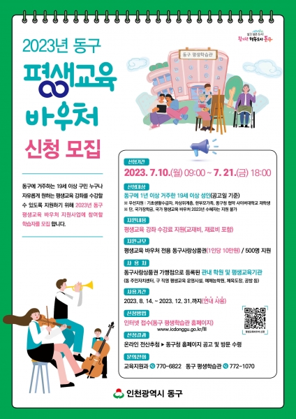 김찬진 동구청장은 “평생교육 수강료, 재료비 지출에 부담을 느끼는 주민들을 위해 경제적 부담 없이 누구나 자유롭게 평생교육 강좌를 선택하고 학습활동에 참여할 수 있도록 동구 평생교육 바우처 지원 사업을 추진할 계획”이라며 “평생교육에 관심 있는 주민 여러분의 많은 신청을 바란다”고 말했다.
