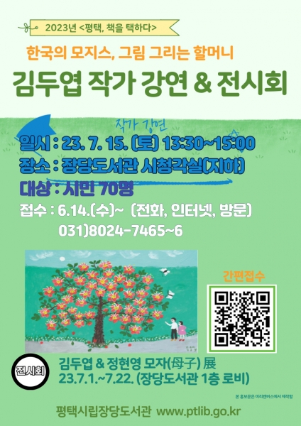 [금요저널] 평택시 장당도서관은 평택시가 2023년 시민과 함께 읽는 책으로 선정한 ‘그림 그리는 할머니 김두엽이다’의 저자 김두엽과 정현영 화가의 콜라보 강연을 오는 15일 오후 1시 30분, 장당도서관에서 진행한다고 밝혔다.