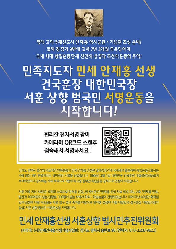 이에 평택시는 민세 안재홍 선생과 원심창 의사의 공적이 제대로 평가받지 못한 점을 부각해 서훈 상향 범시민 공감대를 형성해 평택시민과 청소년들이 서훈 등급 상향 서명운동에 참여할 수 있도록 온·오프라인 홍보를 꾸준히 추진할 계획이다.