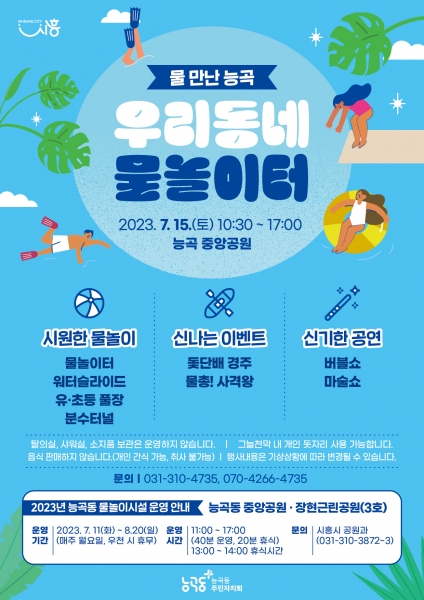 특히 능곡동 중앙공원 내 물놀이 시설 개장과 함께, 멀리 가지 않아도 동네에서 즐길 수 있는 여름 축제를 마련함으로써 주민과 아이 모두 행복한 능곡동을 조성하고자 기획했다.