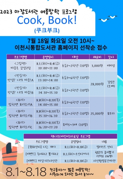 프로그램 참여를 희망하는 어린이는 7월 18일 오전 10시부터 이천시통합도서관 홈페이지를 통해 선착순으로 접수 후 참여할 수 있다.