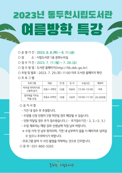 동두천시립도서관 2023년 여름방학 특강 운영
