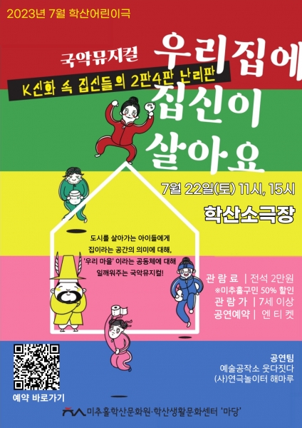7월 22일 학산소극장에서 공연되는 어린이극 ‘우리 집에 집신이 살아요’는 예술공작소 웃다짓다, 연극놀이터 해마루가 준비한 국악뮤지컬로 도시에서 살고 있는 아이들에게 집이라는 공간, 우리 마을이라는 공동체의 의미에 대해 일깨워주는 공연이다.