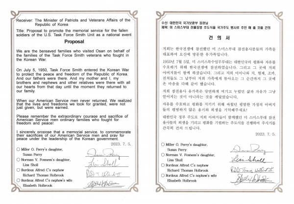 유족들은 건의서를 통해 “스미스 부대는 대한민국 평화와 자유를 수호하기 위해 한국전쟁에 참전했다”며 “대한민국 정부 주도로 참전용사들의 희생을 기리고 평화를 기원하는 추도식을 진행해주기를 바란다”고 밝혔다.