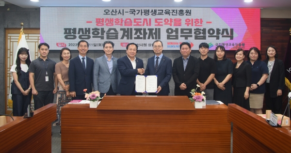 [금요저널] 오산시와 국가평생교육진흥원은 지난 11일 시청 상황실에서 평생학습도시 차원의 평생학습계좌제 운영 기반 마련을 위한 양 기관의 상호협력을 위해 업무협약을 체결했다.