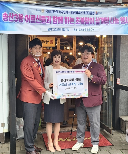 [금요저널] 의정부시 송산3동행정복지센터는 무더위가 시작되는 초복을 맞아 7월 11일 송산로타리 클럽이 독거노인 등 관내 어르신들을 모시고 삼계탕 나눔 행사를 진행했다고 밝혔다.