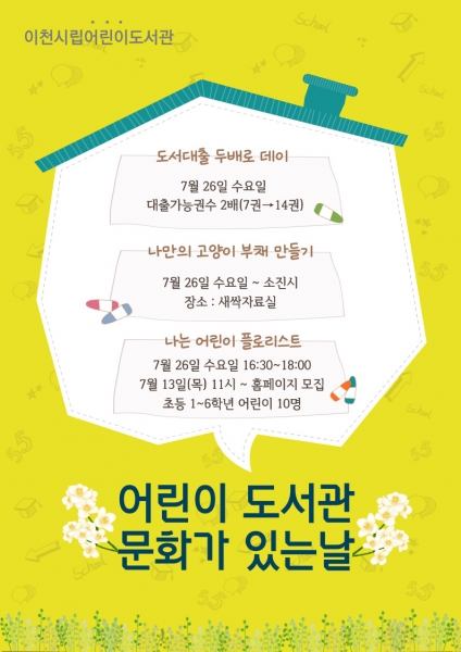 7월 문화가 있는 날에는 1인당 도서 대출 권수가 기존 7권에서 14권까지 확대되는 도서대출 두배로 데이, 고양이 모양의 부채에 친구들이 직접 그림을 그려 나만의 부채를 만들어보는 나만의 고양이 부채 만들기, 아이들이 직접 플로리스트가 되어 생화를 이용해 꽃 케이크를 만들어 보는 나는 어린이 플로리스트를 진행한다.