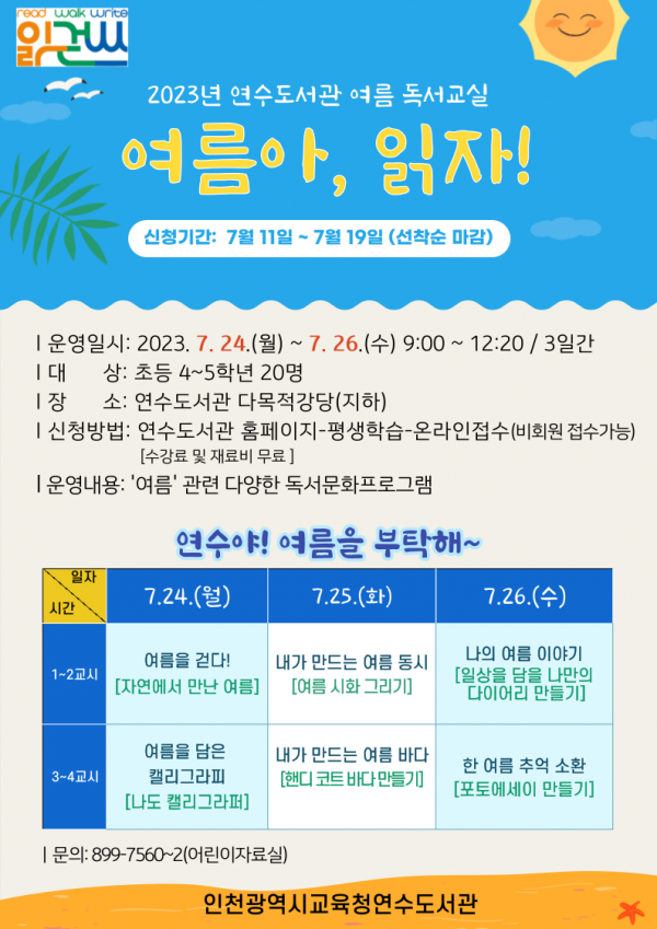 연수도서관은 초등 4~5학년 학생을 대상으로 7월 24일부터 26일까지 ‘여름아, 읽자’를 주제로 운영한다.