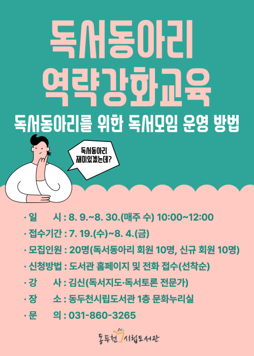 [금요저널] 동두천시 평생교육원 시립도서관은 8월 9일부터 30일까지 4회에 걸쳐 수요일 오전 10시부터 2시간 동안 ‘독서 동아리 역량 강화 교육’을 운영한다.
