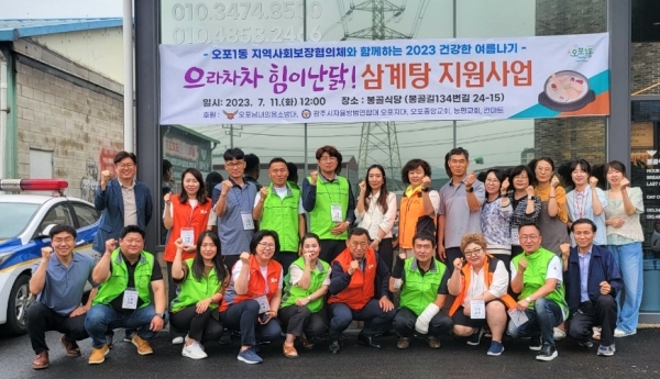 [금요저널] 광주시 오포1동 지역사회보장협의체는 11일 건강한 여름나기를 위해 취약계층 어르신 150명을 대상으로 ‘으라차차 힘이난닭’ 삼계탕 식사 지원 및 이웃돕기 후원물품 전달식을 개최했다.