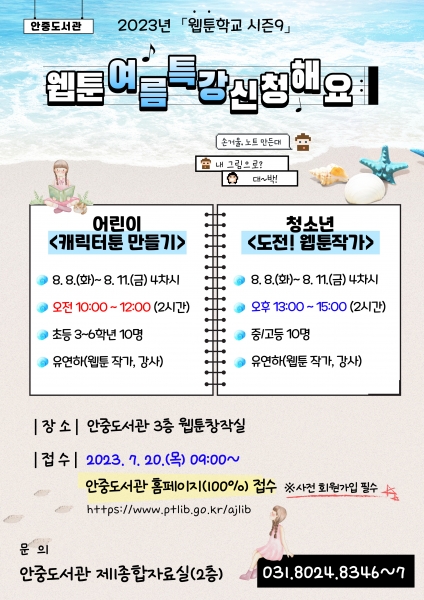 여름 특강은 어린이와 청소년을 대상으로 하며 안중도서관 웹툰 창작실에서 대면으로 운영된다.