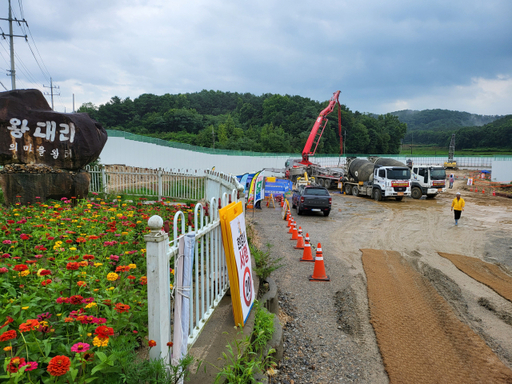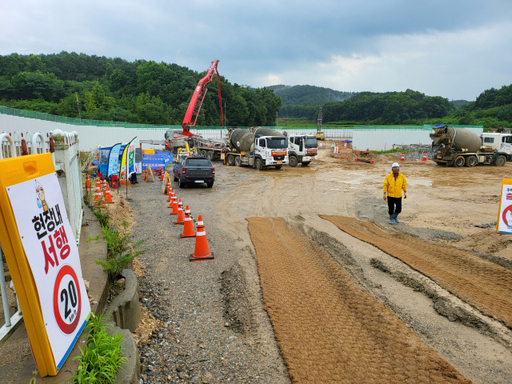14일 여주시와 SK건설 등에 따르면 SK하이닉스가 시행하는 용인반도체클러스터 산업단지 용수공급의 일환으로 여주시 세종대왕면 왕대리에 남한강변 취수펌프장(하루 취수량 공업·생활용수 27만3천여t 처리규모)을 건립하기 위해 부지를 조성하면서 폭우가 내린 지난 13일 레미콘차량(6여㎡) 43대(250여㎡) 타설을 강행했다.
