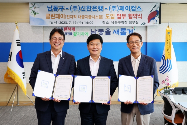 [금요저널] 인천시 남동구는 최근 구청장 집무실에서 ㈜신한은행, ㈜페이컴스와 차세대 전자적 대금지급 시스템인 ‘클린페이’도입을 위한 업무협약을 체결했다고 20일 밝혔다.