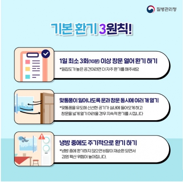 하루 최소 3회, 매회 10분 이상 창문 열어 환기하기 맞통풍이 일어나도록 문과 창문 동시에 여러 개 열기 냉방 중에도 주기적으로 환기하기와 같은 기본환기 3원칙을 준수해야 한다.