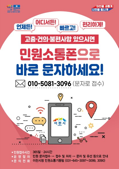 또한, 민원소통기동팀은 민원 처리의 접근성과 행정기관과의 소통을 증대시키기 위해 올해 1월부터 문자로 간단하게 민원을 접수할 수 있는 민원소통폰을 도입해 시민들에게 만족스러운 반응을 얻고 있다.