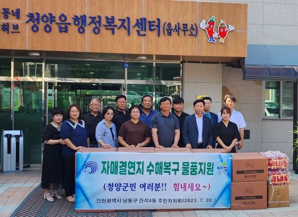 [금요저널] 인천시 남동구 간석4동 주민자치회는 최근 집중호우로 많은 피해를 입은 자매 결연지 청양읍에 수해복구 물품을 지원했다고 21일 밝혔다.