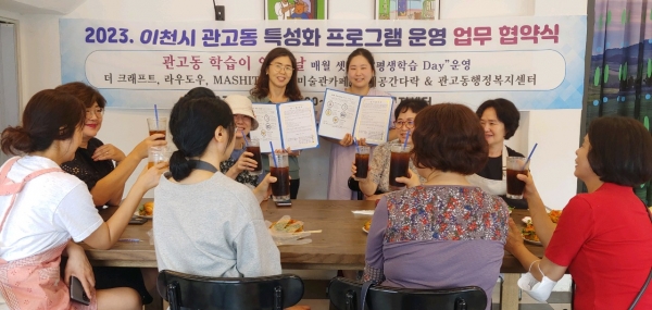 [금요저널] 이천시 관고동평생학습센터는 지역 특성화 프로그램으로 평생학습 주간 평생학습 Day 운영을 위한 “난 학습하러 우리동네 카페로 간다” 카페학습 운영을 위해 관내 카페대표 5명과 업무 협약식을 개최했다.