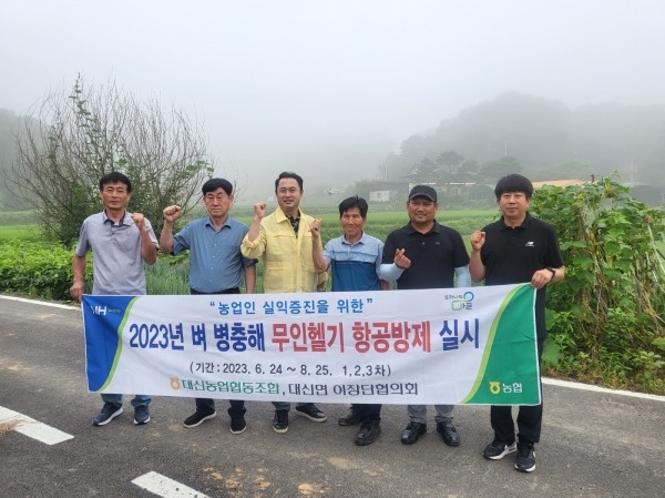 이번 항공방제는 대신농협 주관으로 지속되는 장마로 인해 덥고 습한 날씨가 이어지면서 연약해진 벼의 잎도열병과 노린재 등 병해를 예방하고자 지난 6월 1차 방제에 이어 2차로 진행됐다.