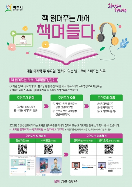 2021년부터 시작한 이 사업은 국립중앙도서관 ‘도서관 정보나루’의 공공도서관 이용통계 빅데이터 분석을 통해 추천도서를 선정, 책을 추천하는 글을 사서의 목소리로 직접 녹음해 들려주고 이를 수어영상 콘텐츠로도 제공하는 도서추천 서비스이다.