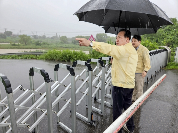 [금요저널] 이권재 오산시장이 지난 23일 호우 특보 발표에 따라 오산천 출입 통제 현장을 직접 둘러보았다.