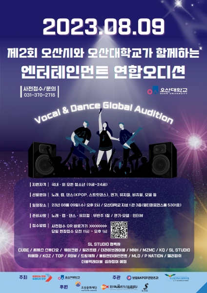 [금요저널] 오산시와 오산대학교가 공동주최하고 오산대학교 보컬KPOP콘텐츠과와 오산중앙청소년문화의집이 공동주관하는 '제2회 오산시와 오산대학교가 함께하는 엔터테인먼트 연합오디션'이 8월 9일 오후 2시 오산대학교 지성1관 퍼포먼스룸에서 개최된다.