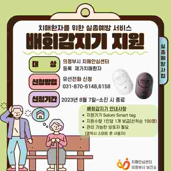 [금요저널] 의정부시 보건소 치매안심센터는 치매환자 실종예방사업의 일환으로 8월부터 배회 증상으로 실종 위험이 있는 재가 치매어르신 100명에게 배회감지기를 무상지원한다.