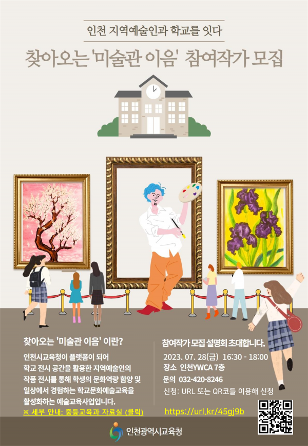 인천시교육청은 인천지역에서 활동하는 미술 전업 작가를 대상으로 28일 오후 4시 30분부터 6시까지 인천 YWCA에서 사업 설명회를 개최하며 8월 4일까지 참여작가 신청을 받는다.