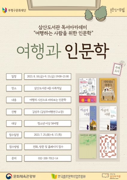 [금요저널] 부평구 삼산도서관이 8월 17일까지 독서아카데미로 여행하는 사람을 위한 인문학 제3주제 ‘여행과 인문학’ 참가자를 모집한다.