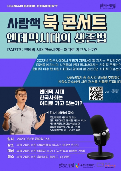 [금요저널] 부평구 부개도서관이 8월 24일까지 온라인 사람책 북 콘서트 ‘엔데믹시대 한국사회는 어디로 가고 있는가?’ 참여자를 모집한다.