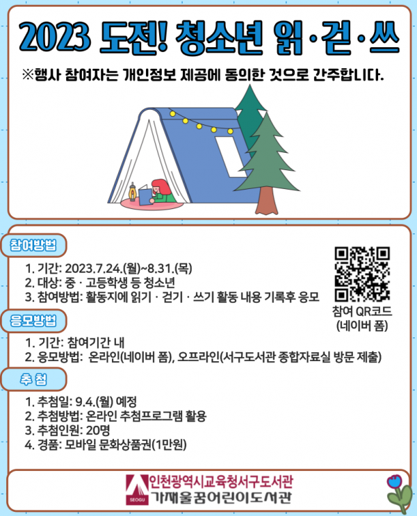 [금요저널] 화 확산을 위해 중·고등학생 등 청소년을 대상으로 온오프라인 ‘2023 도전 청소년 읽·걷·쓰’를 24일부터 8월 31일까지 운영한다.
