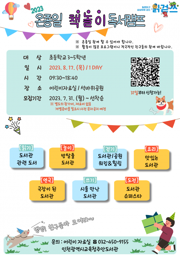 [금요저널] 인천광역시교육청주안도서관은 초등학생을 대상으로 ‘온종일 책놀이 독서캠프’를 8월 17일 운영한다.