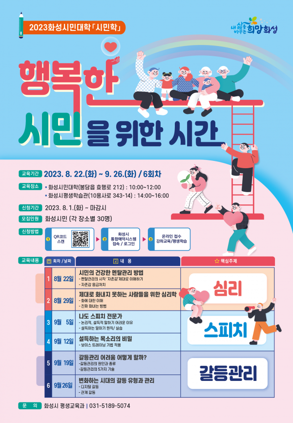 이번 교육은 화성시민대학과 화성시평생학습관에서 8월 22일부터 9월 26일까지 총 6회에 걸쳐 진행되며 심리, 스피치, 갈등관리 등 시민으로서 책임감 있는 태도와 문제 해결 역량을 갖추기 위한 분야들을 심도 있게 다룰 예정이다.