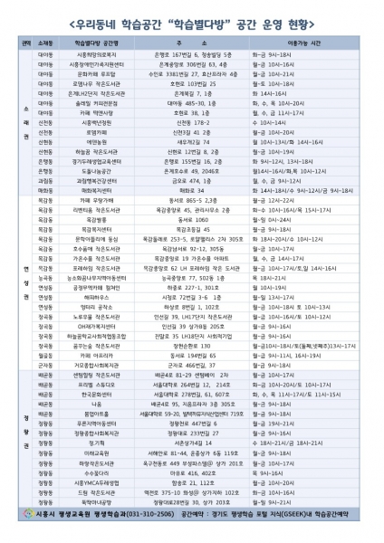 시 관계자는 “학습별다방을 통해 이웃과 함께 배우고 싶은 프로그램을 근거리에서 누리는 생활 속 평생학습 문화가 활성화되길 바란다”고 전했다.