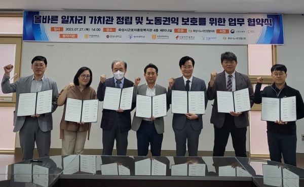 [금요저널] 화성시 노사민정협의회가 27일 화성시근로자종합복지관에서 화성시 관내 6개 대학과 일자리가치관 정립 업무협약을 맺었다.
