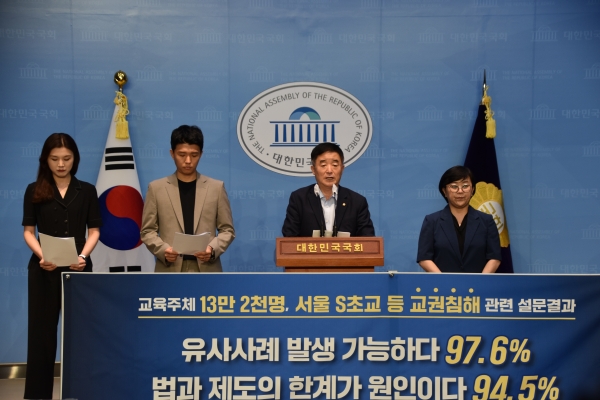 [금요저널] 국회 교육위원회 소속인 강득구 의원 과 교육정책디자인연구소는 28 일 오전 9 시 40 분 , 국회 소통관에서 기자회견을 열고 ‘ 서이초 사건 등 교권침해 관련 교육주체 13 만 2,359 명 설문조사 결과 ’ 를 발표했다.