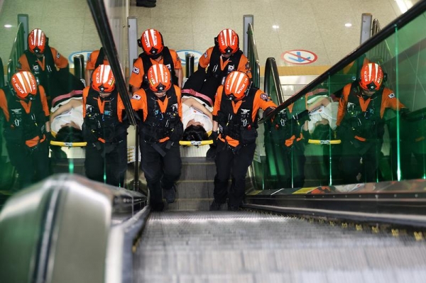 훈련은 지난달 분당 수내역에서 발생한 에스컬레이터 역주행으로 인한 사고에 대비하기 위해 엘리베이터 승객 갇힘과 에스컬레이터 넘어짐 사고 상황을 가정해 진행됐다.