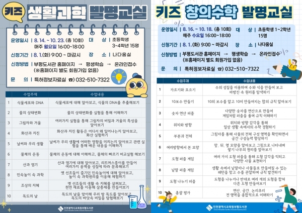 [금요저널] 인천광역시교육청부평도서관은 초등학생 때부터 융합적 창의인재로 발전할 수 있는 체험 기회를 제공하기 위해 ‘키즈 생활과학 발명교실’과 ‘키즈 창의수학 발명교실’을 8월부터 10월까지 운영하며 8월 1일 오전 9시부터 도서관 홈페이지를 통해 참가자를 모집한다.