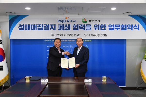 동두천시는 경기도 내 성매매집결지가 점차 폐쇄되어 가고 있는 것과 관련해 성매매집결지 폐쇄를 위해 다양한 정책을 추진하고 있는 파주시와 업무협약을 체결하고 상호 협업체계 구축을 통한 공동 대응을 약속했다고 밝혔다.