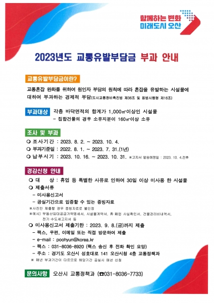 [금요저널] 오산시가 8월 2일부터 10월 4일까지 2023년도 교통유발부담금 부과 대상이 되는 시설물에 대한 전수조사에 나선다.