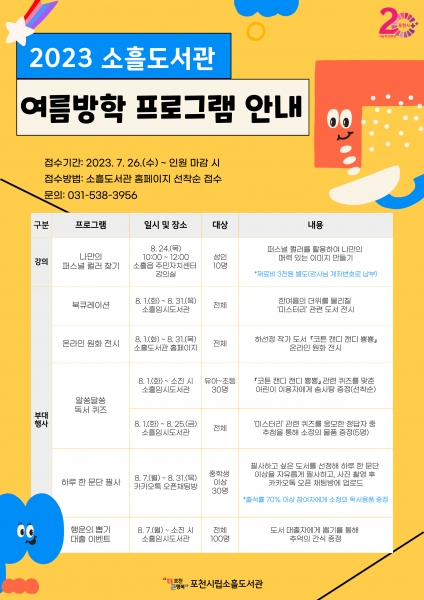 소흘도서관 관계자는 “무더운 여름 도서관을 찾는 시민들이 유익한 프로그램을 통해 즐겁고 의미 있는 시간을 보내길 바란다”고 전했다.