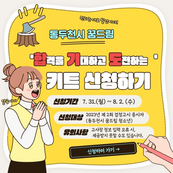 신청 기간은 8월 2일까지로 동두천시 관내에 거주하는 만9세~만24세 검정고시에 응시하는 학교 밖 청소년이면 누구나 신청이 가능하다.