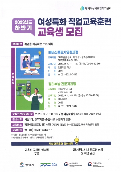 평택여성새로일하기센터, 2023년 하반기 직업교육훈련 교육생 모집