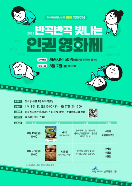 [금요저널] 세종시 반곡동도서관이 여름방학을 맞이해 오는 13일과 27일 10시 총 2차례에 걸쳐 반곡동 복합커뮤니티센터 4층 다목적강당에서 ‘반곡반곡 빛나는 인권영화제’를 연다.