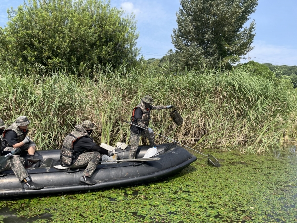김준혁 중령을 비롯한 40여명의 육군 수도군단 특공연대 장병들은 6대의 고무보트에 나눠 탄 채 저수지 구석구석을 파고들며 뜰채와 집게로 물에 떠 있는 나뭇가지와 쓰레기를 꼼꼼하게 수거했다.