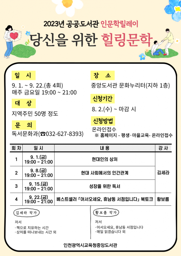 [금요저널] 인천광역시교육청중앙도서관은 ‘당신을 위한 힐링 문학’ 강좌를 9월 1일부터 22일까지 매주 금요일 중앙도서관 문화누리터에서 운영한다.